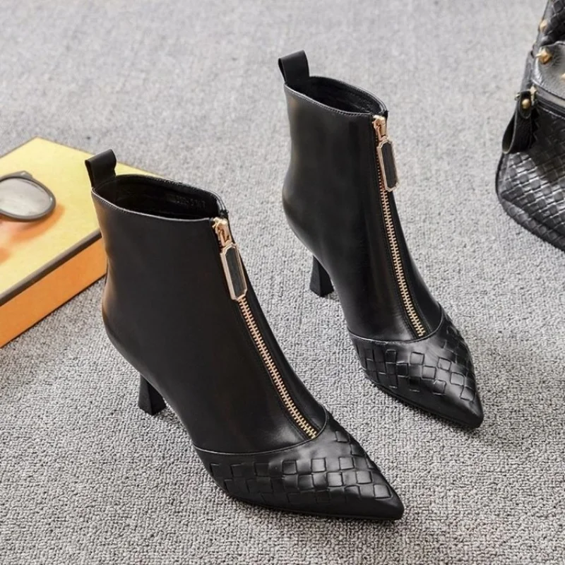 2025 New Women's Fashion Ankle Boots - Black Glossy Leather Quilted Booties with Front Zipper & Mid-Heel, Slim-Fit Winter Boots