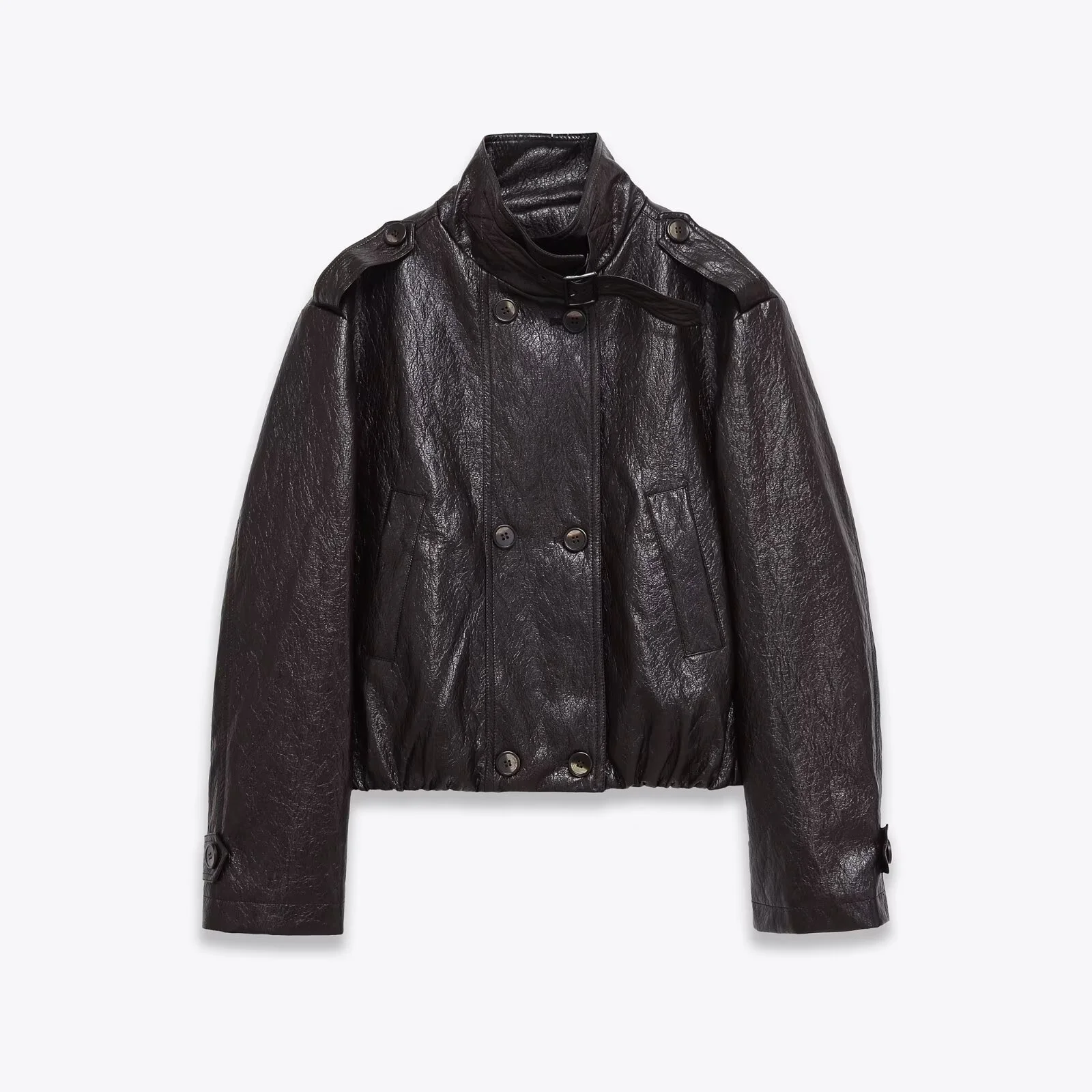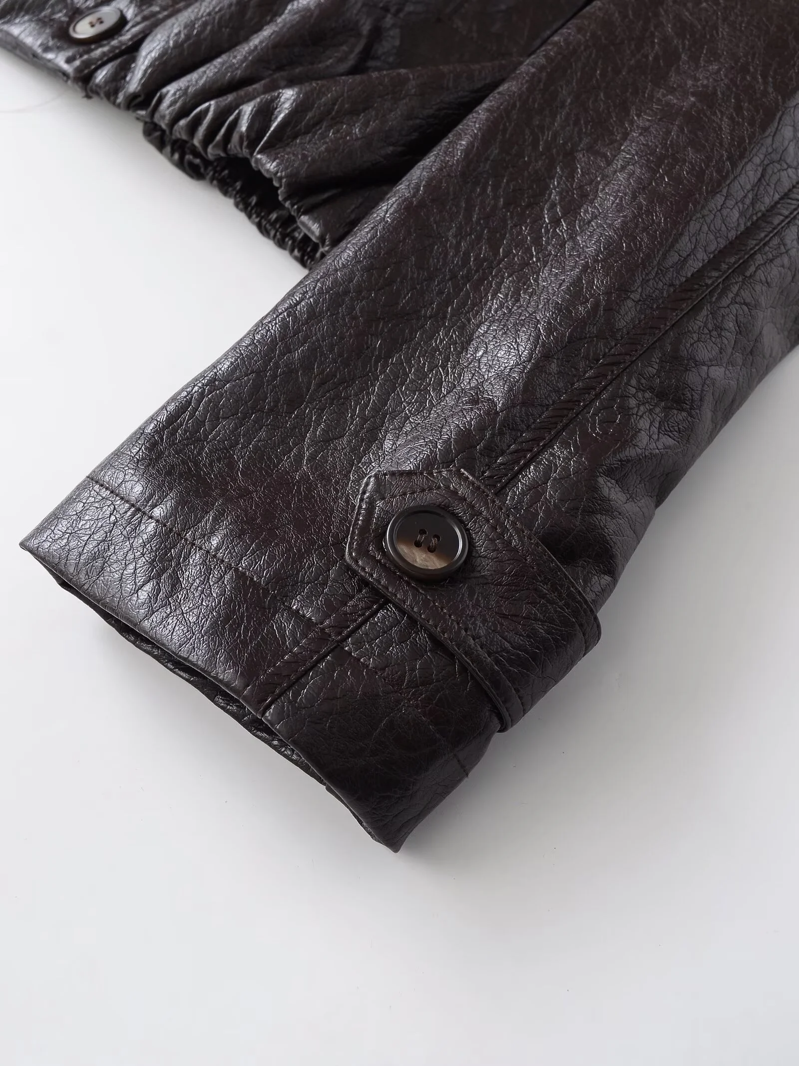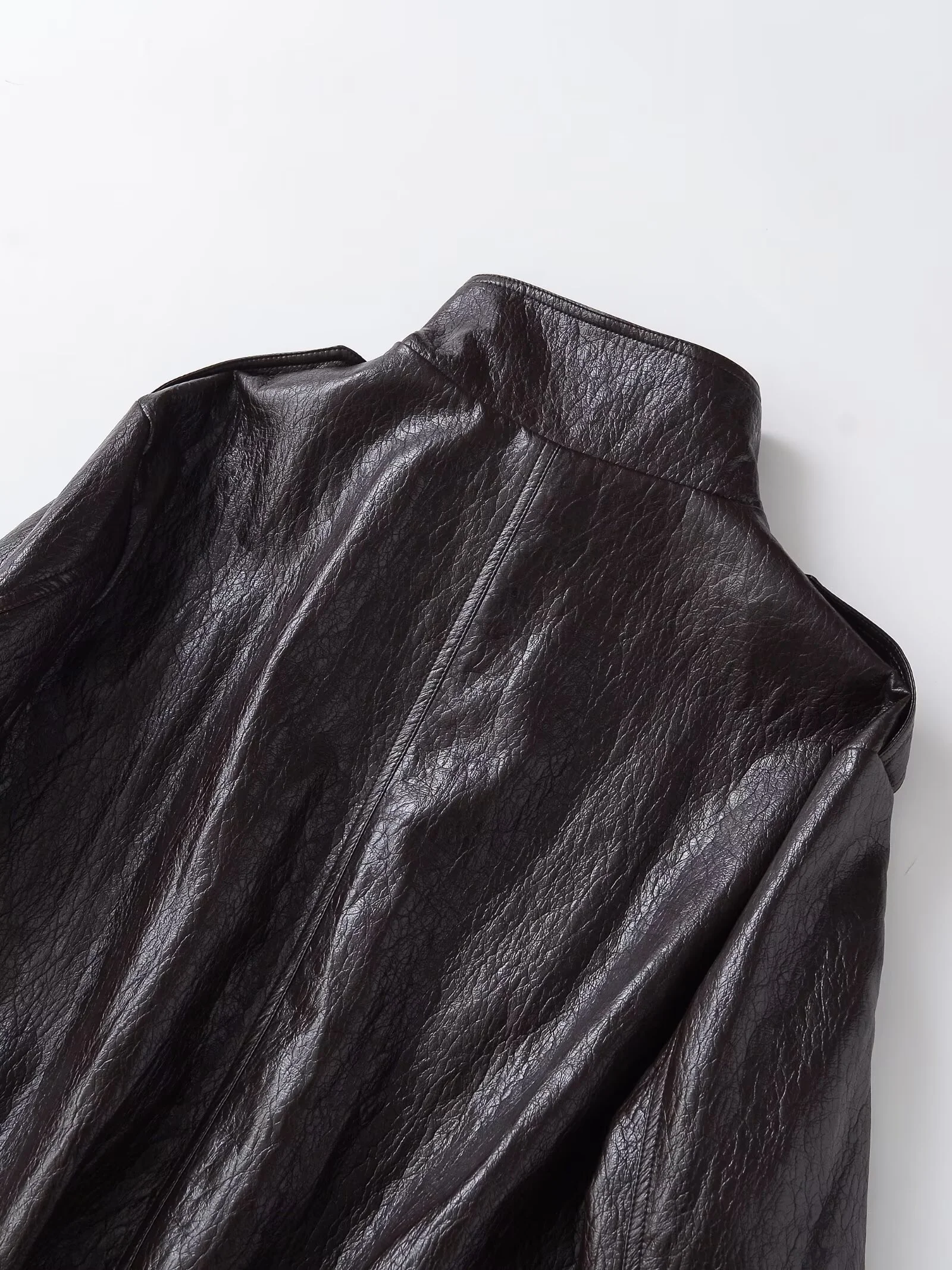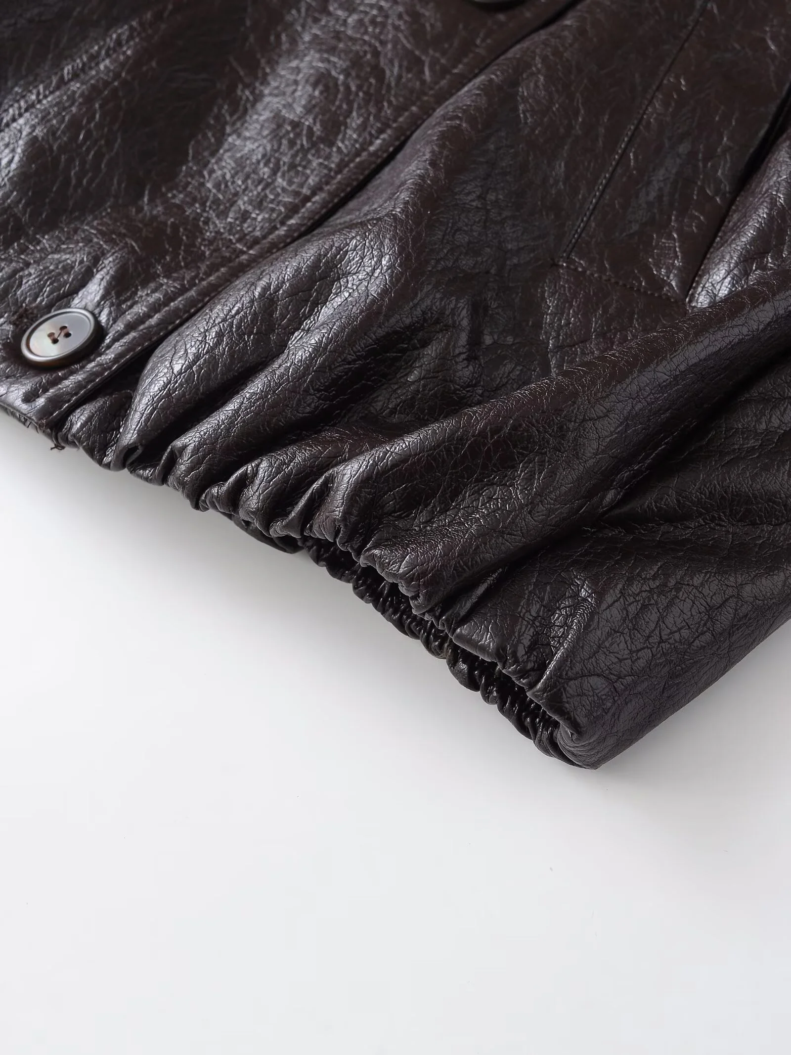 2025 Winter New Women's Casual Fashionable Simple Stand Collar Long Sleeve Leather Button Double-Breasted Loose Short Jacket