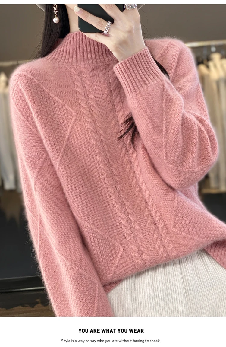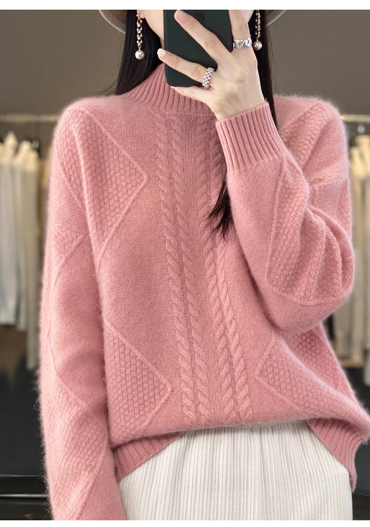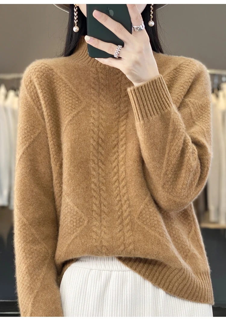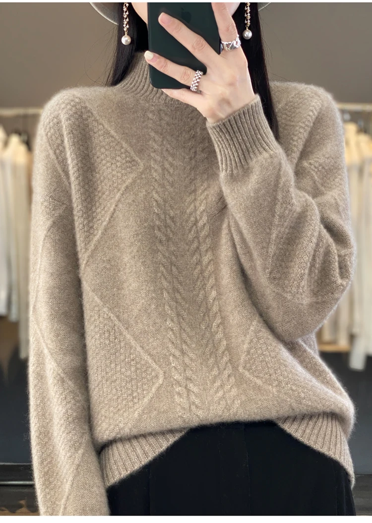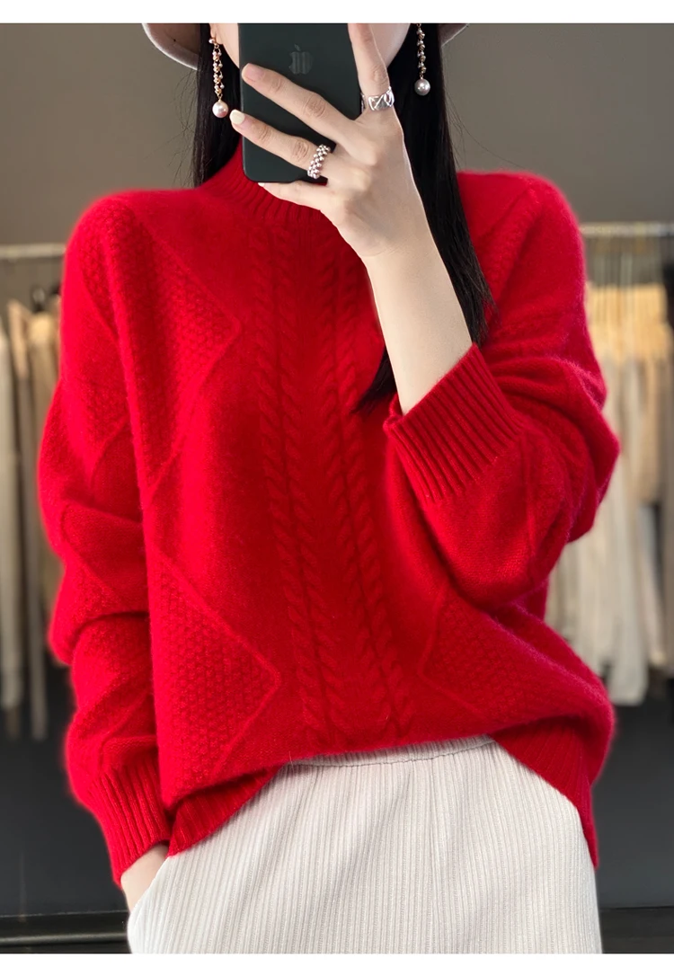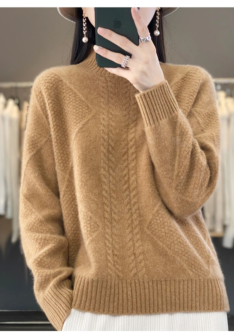 Autumn Winter Women 100% Merino Wool Sweater Striped Twisted Knitted Pullover Casual Loose Long Sleeve Cashmere Clothing Tops