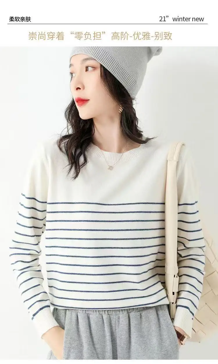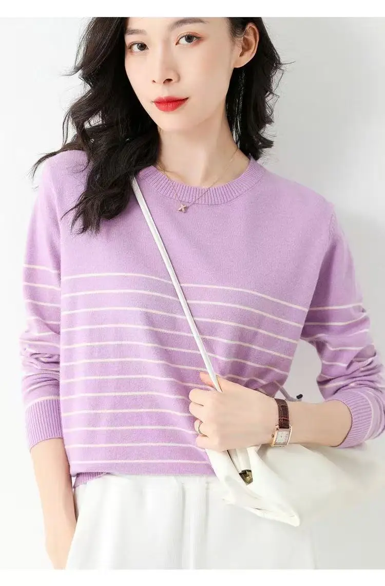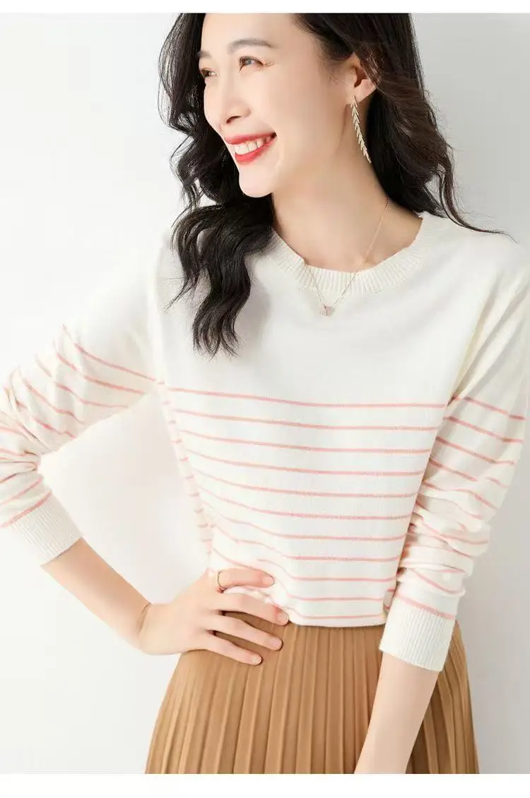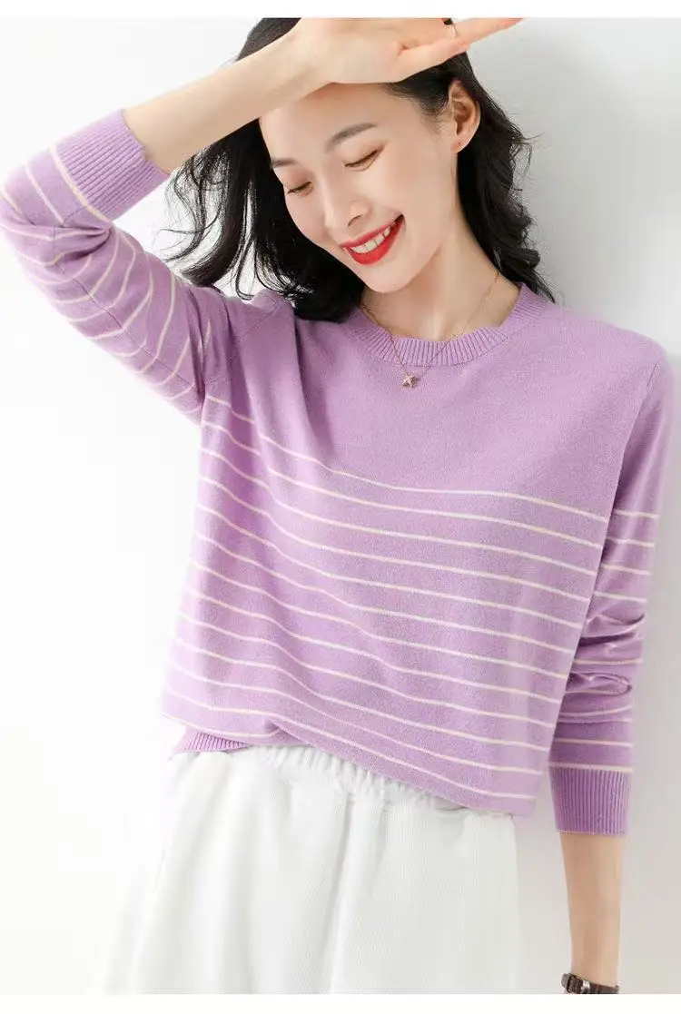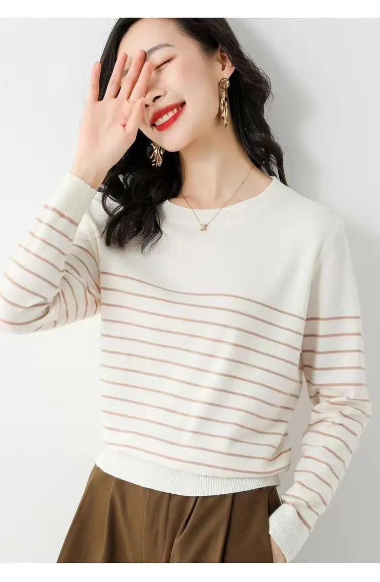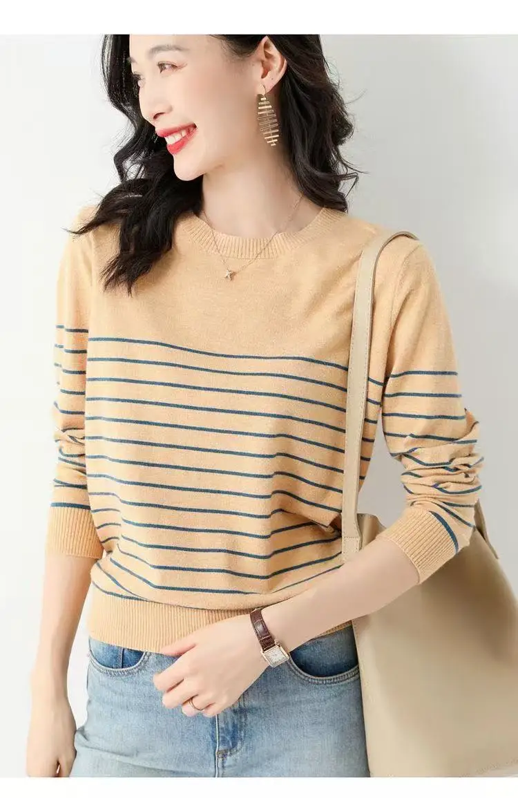 Spring New Loose round Neck Stripe Color Block Knitted Wool Blend Base Shirt Women's Sweater Casual Comfortable Top