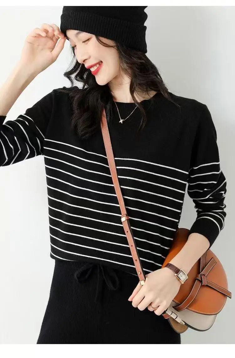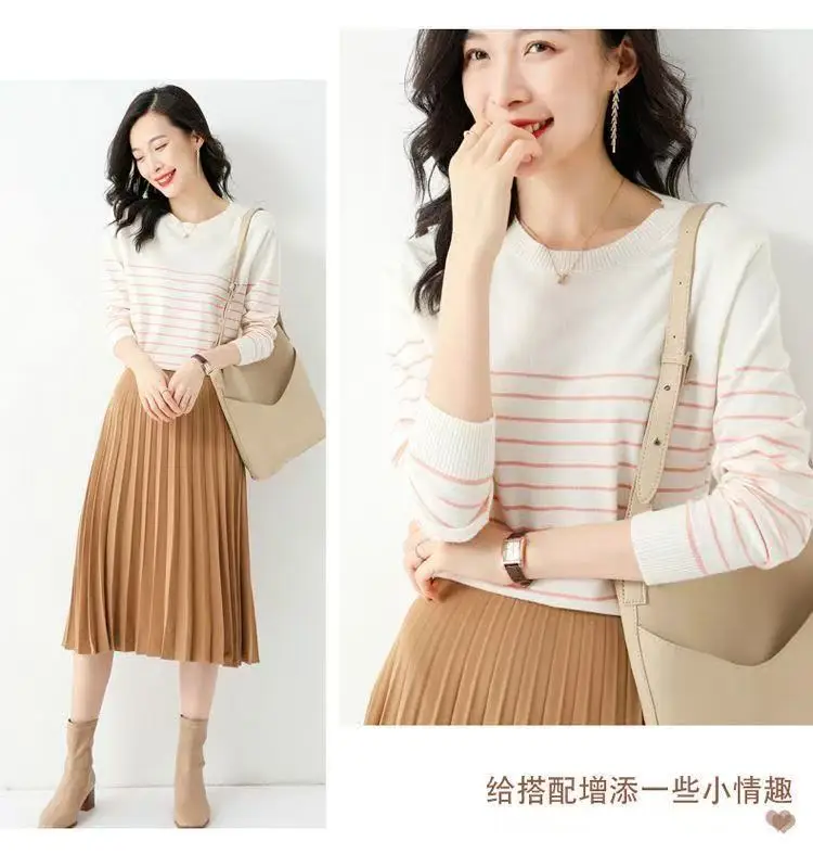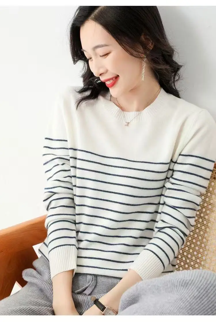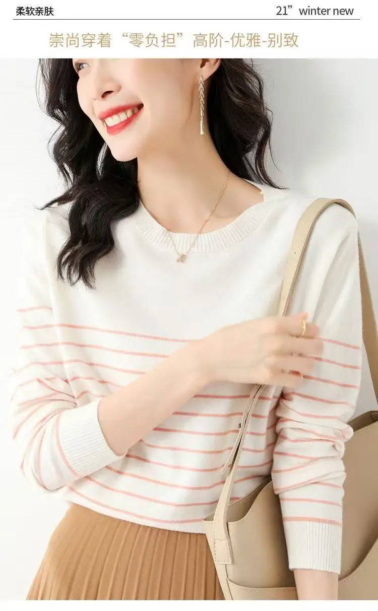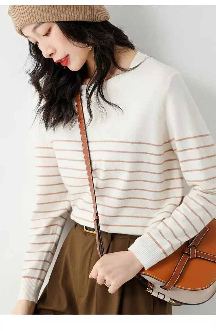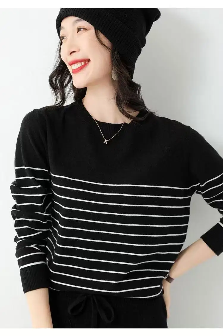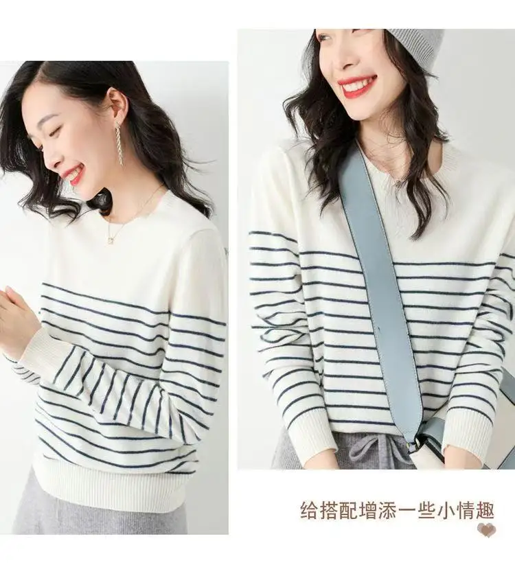 Spring New Loose round Neck Stripe Color Block Knitted Wool Blend Base Shirt Women's Sweater Casual Comfortable Top