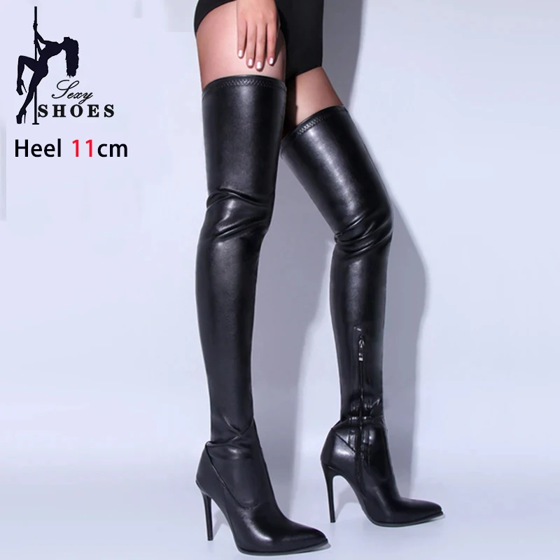 Women's Boots High Heel 11cm Matte Black Over Knee Boots Large Size 34-44 Side Zipper Fashion Personality Striper Long Boots